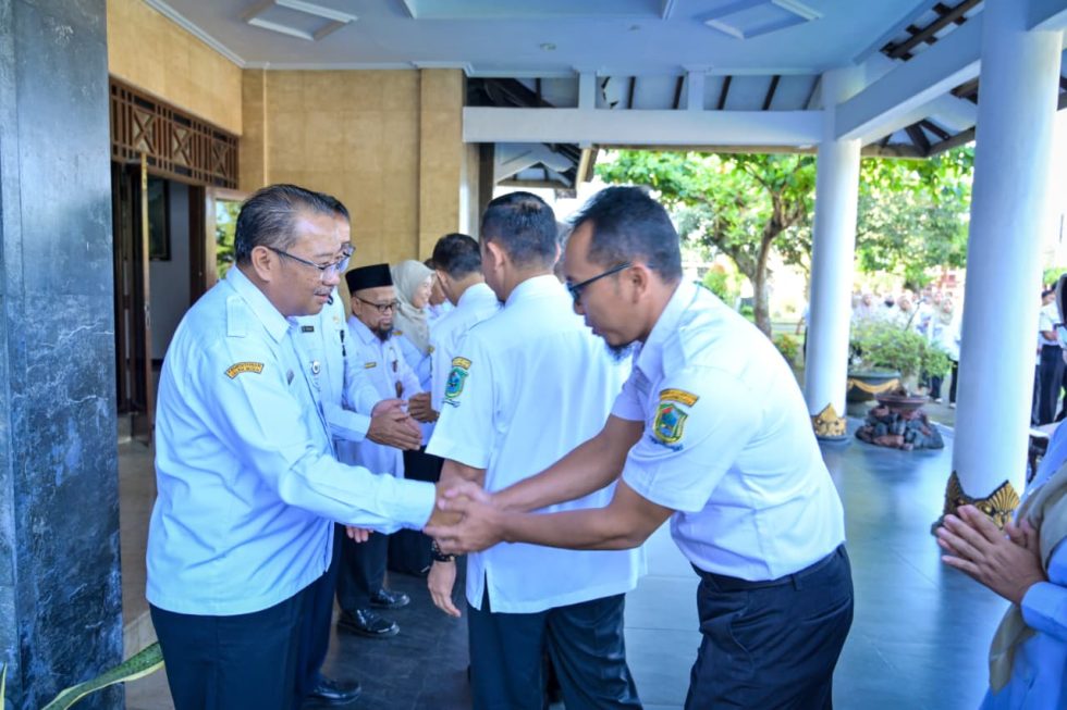 Selepas apel pagi kegiatan dilanjutkan dengan jabat tangan, Sekda dan jajarannya serta beberapa Kepala OPD bersalam-salaman dengan karyawan dan karyawati di lingkungan Sekretariat Daerah.