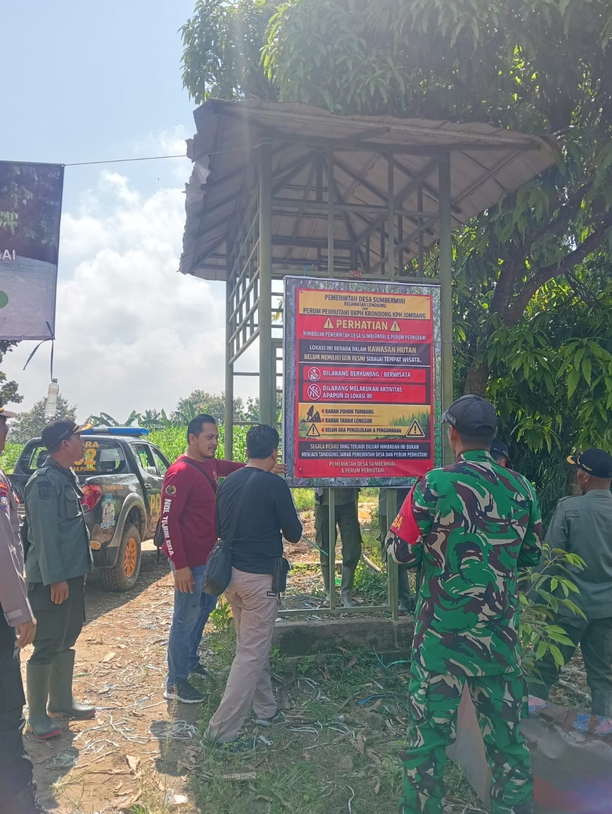 Turut hadir dalam pemasangan plang penutupan/himbauan di lokasi tersebut diantaranya ‘ Asper /KBKPH Krondong(Marsono) dan jajarannya ,.Kapolsek Lengkong yang di wakili Kanit Reskrim ,Kanit Binmas , Babinkamtipmas ,Babinsa Kepala Desa Sumbermiri (Suryadi) Ketua LMDH Wono Joyo Langgeng.serta Ketua BPD .