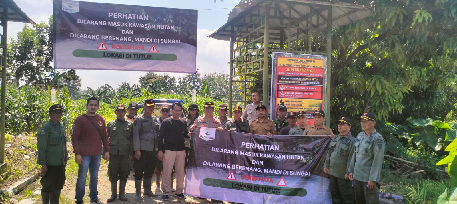 Jombang, Radarreclasseering.com – Perhutani BKPH Krondong KPH Jombang berrsama TNI Polri Menutup Wisata Kali Grojokan Duwur Desa Sumbermiri Kecamatan Lengkong Kabupaten Nganjuk Jawa Timur.
