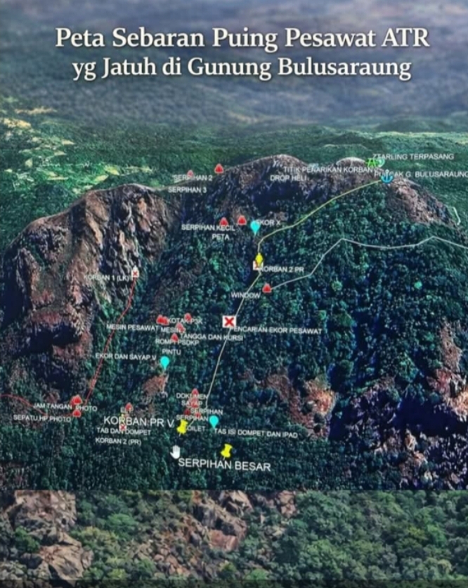 ​07:46 WITA: Helikopter SAR mengonfirmasi visual puing-puing pesawat di ketinggian 1.353 mdpl. Tim darat mulai merintis jalur menembus hutan dan tebing karst.[9, 10]