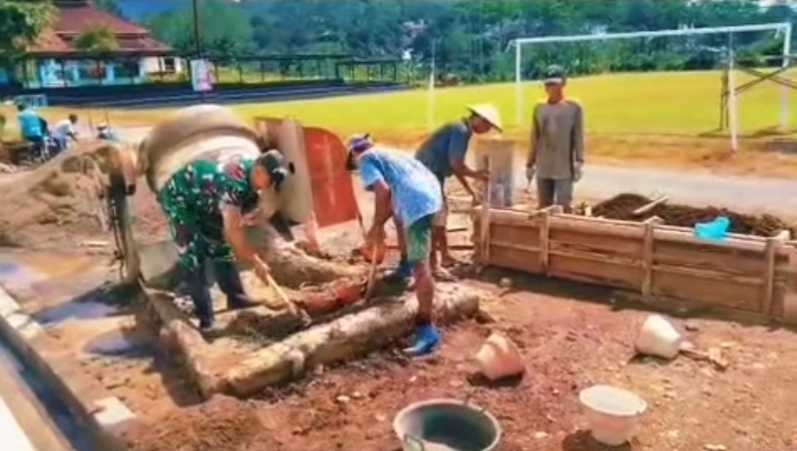 Di tengah aktivitas tersebut, Babinsa Koramil 12/Sigaluh, Serda Nur Arifin, hadir mendampingi jalannya pembangunan.