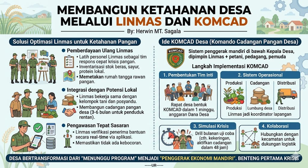 Linmas bukan sekadar “satpam desa”, tetapi dapat menjadi garda terdepan dalam pemantauan stok pangan, distribusi bantuan, serta pengawasan agar tepat sasaran, tanpa harus bergantung pada petunjuk teknis dari atas.