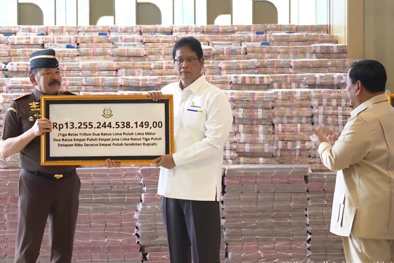 Penyerahan Berita Acara dan uang pengganti kerugian negara dilakukan secara simbolis oleh Jaksa Agung RI kepada Menteri Keuangan RI, disaksikan langsung oleh Presiden Prabowo Subianto.