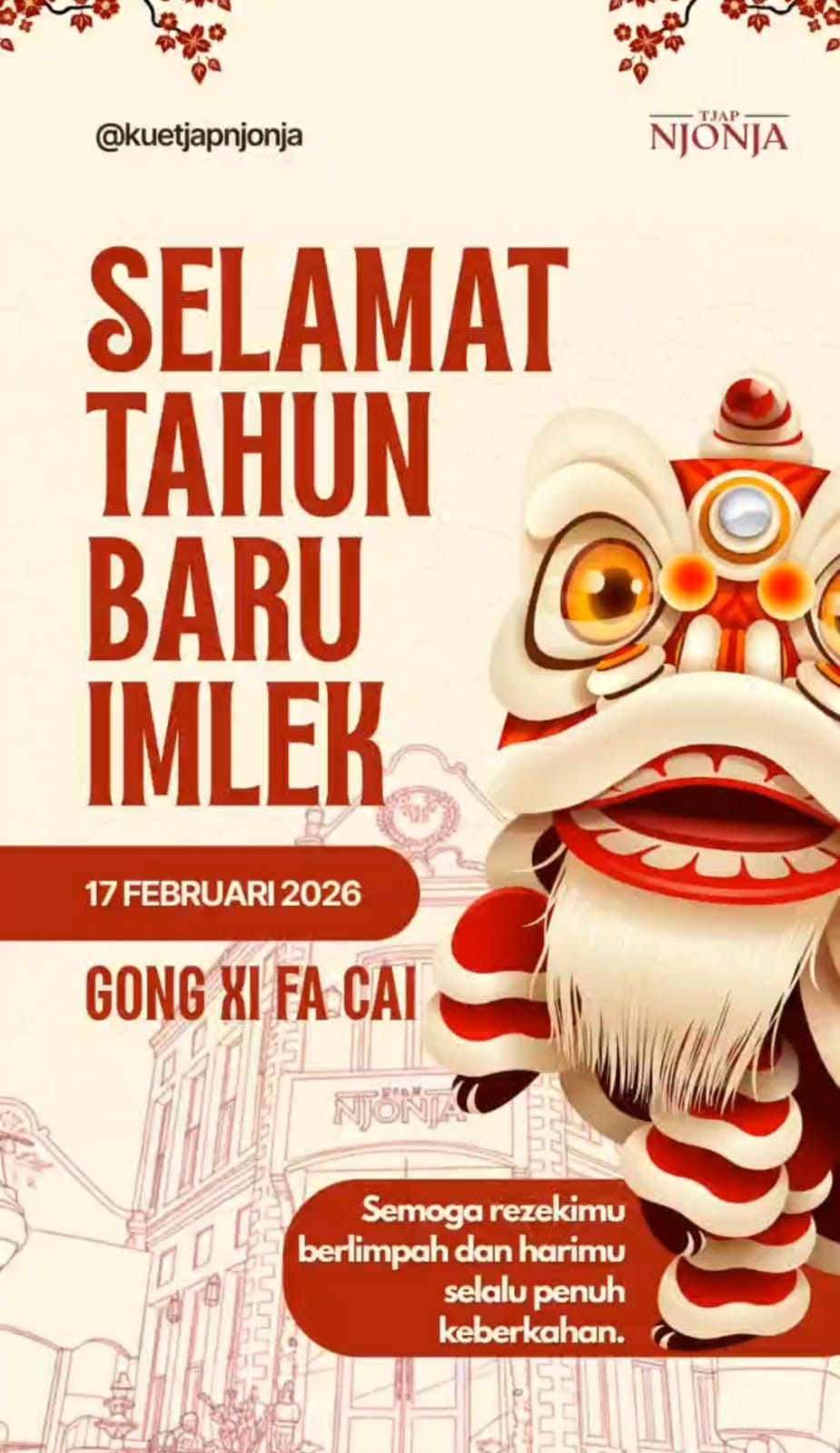 Ucapan tersebut turut dipublikasikan melalui akun media sosial @kuetjapnjonja dengan identitas “TJAP NJONJA”, sebagai bentuk partisipasi dalam memeriahkan perayaan Imlek tahun ini.