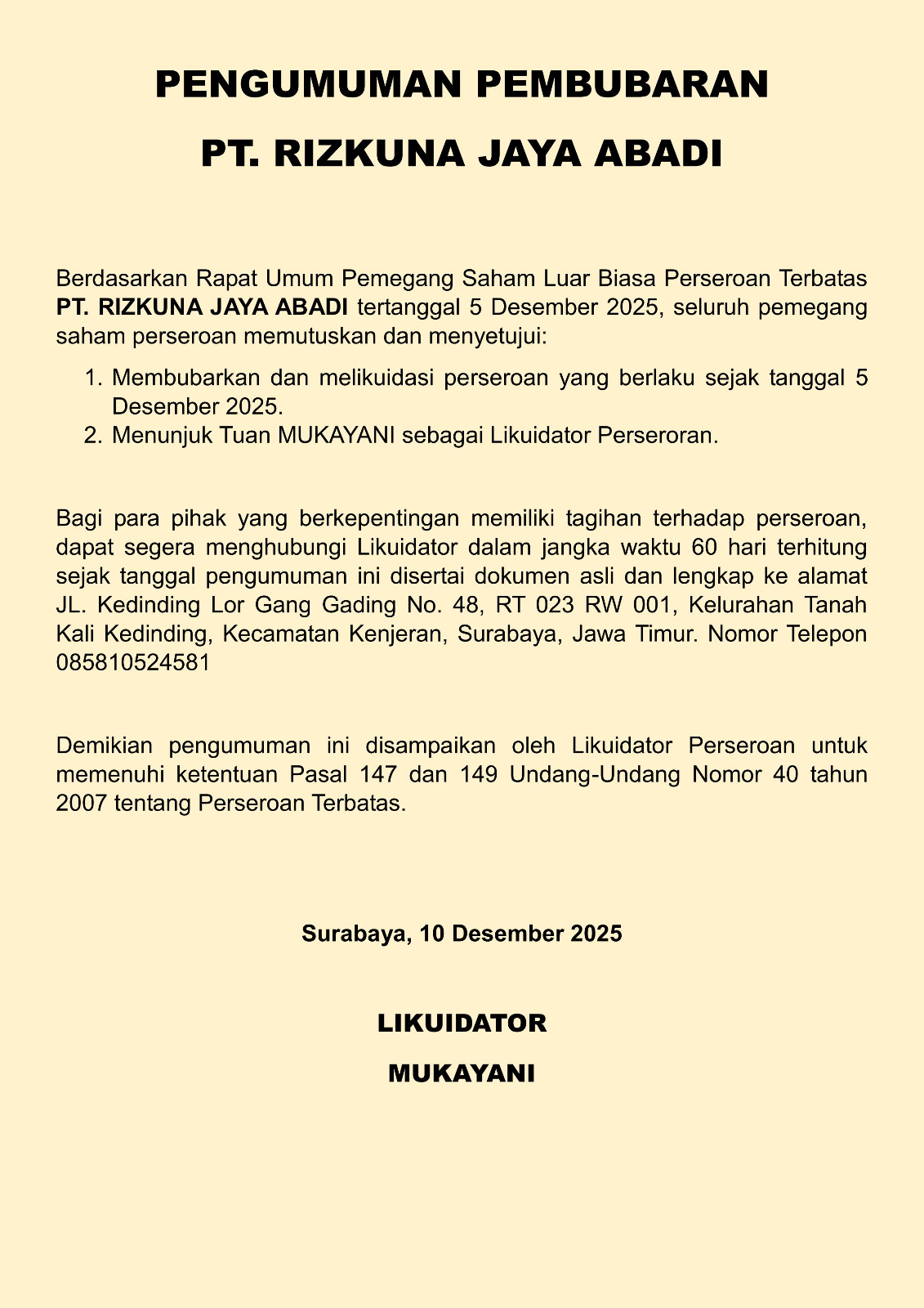 SURABAYA, 10 Desember 2025 – PT. Rizkuna Jaya Abadi secara resmi dibubarkan dan akan Dilikuidasi sejak tanggal 5 Desember 2025, sesuai keputusan yang diambil dalam Rapat Umum Pemegang Saham (RUPS) Luar Biasa perseroan. Keputusan tersebut kemudian diumumkan oleh Tuan Mukayani, yang juga ditunjuk sebagai Likuidator Perseroan dalam rapat yang sama.