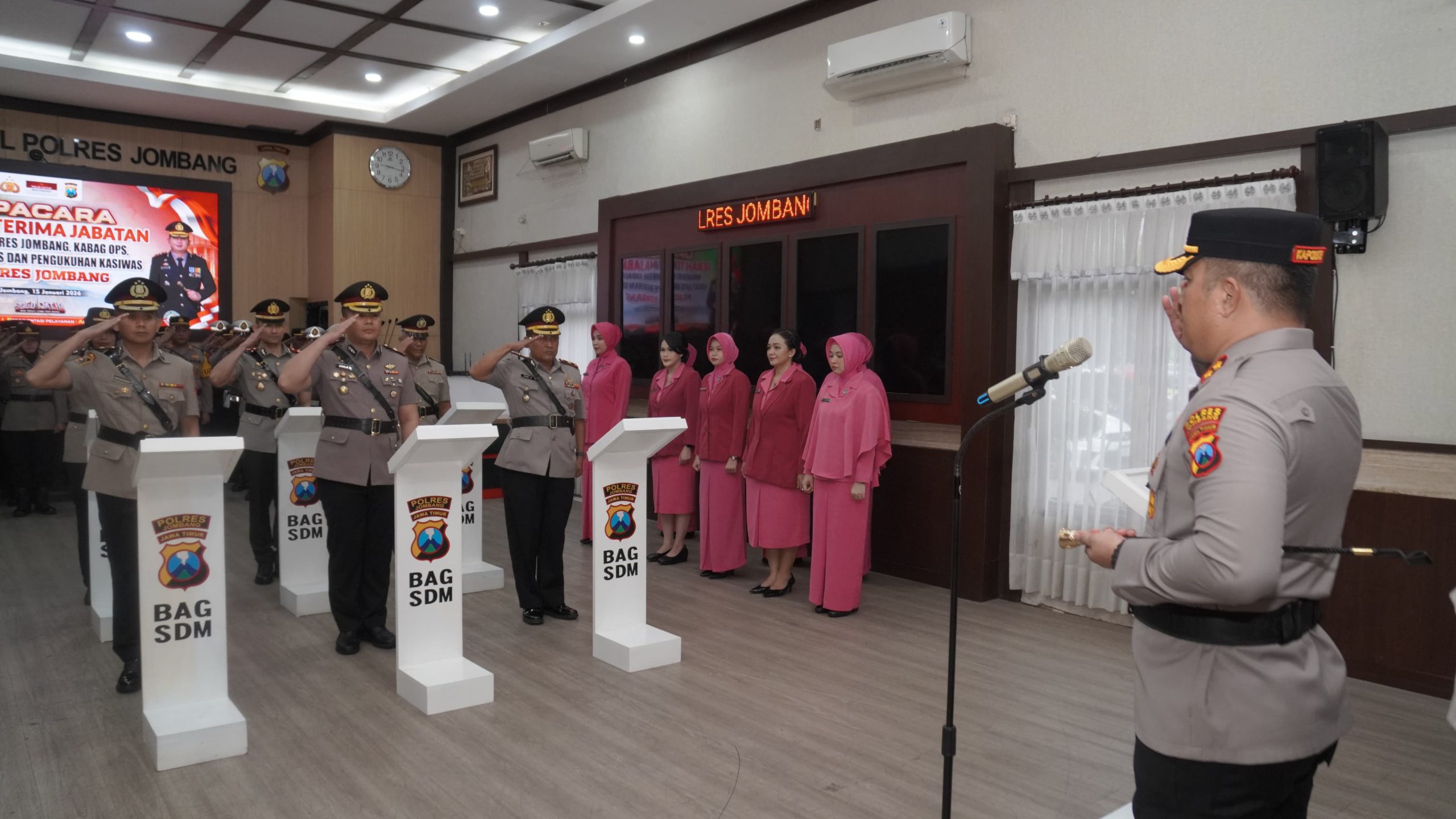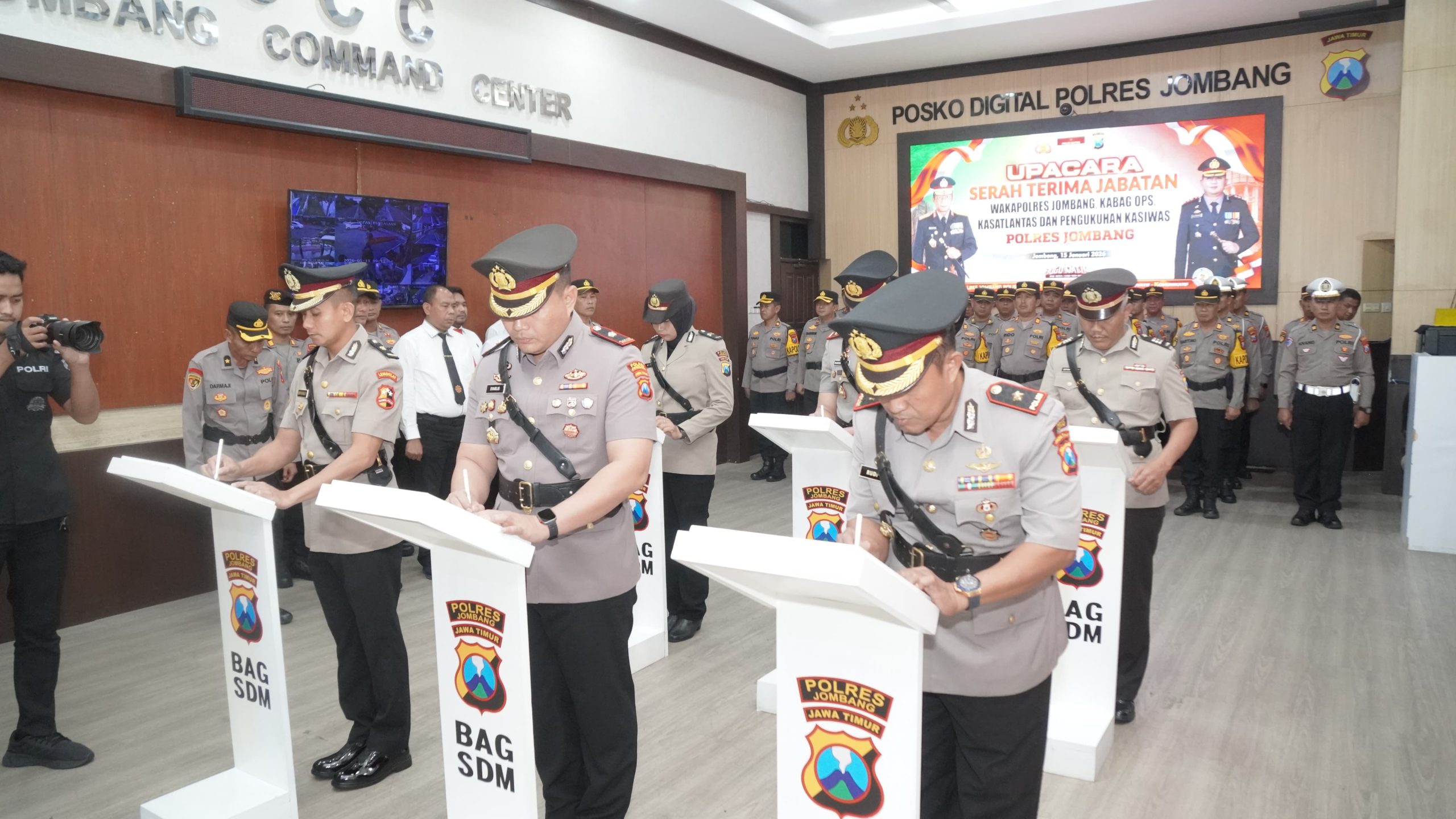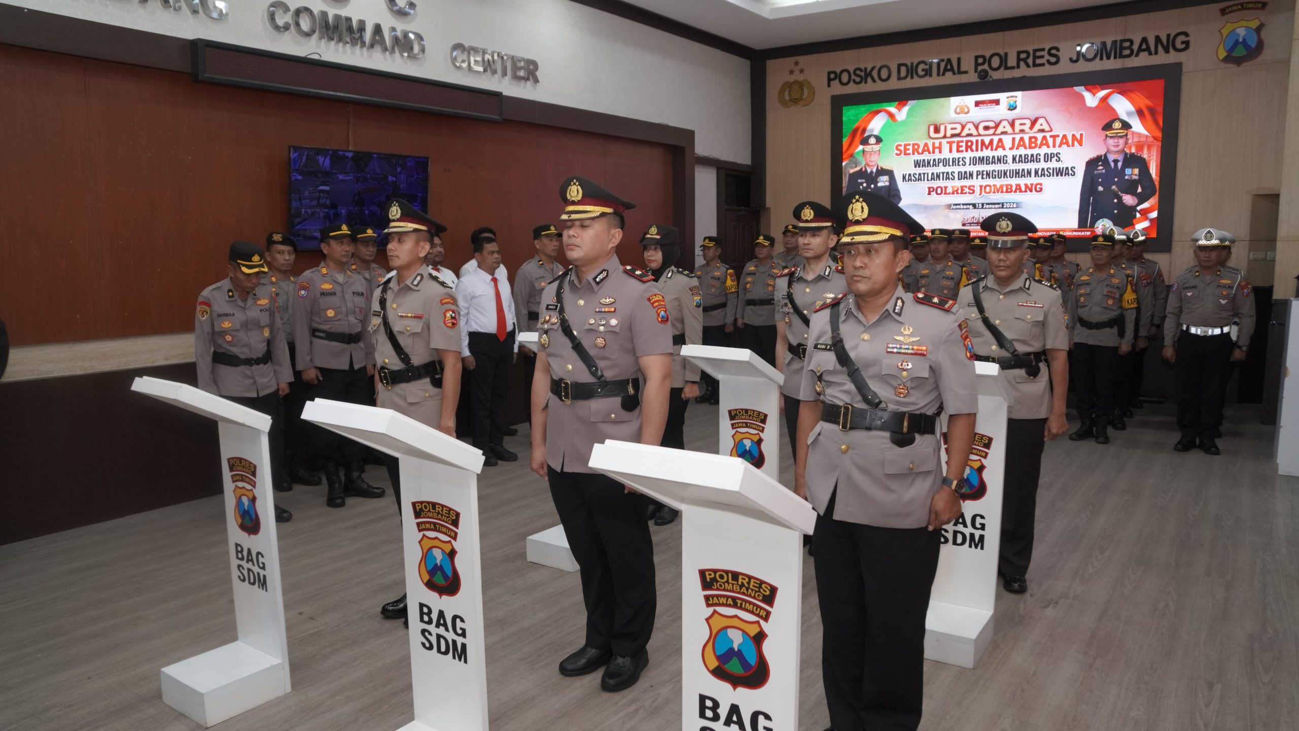 Jombang,http://radarreclasseering.com – Polres Jombang menggelar upacara serah terima jabatan (sertijab) Wakapolres, Kabagops, Kasat Lantas serta pengukuhan jabatan Kasiwas, Kamis (15/1/2026) pagi. Kegiatan berlangsung di Ruang Jombang Command Center Mapolres Jombang.