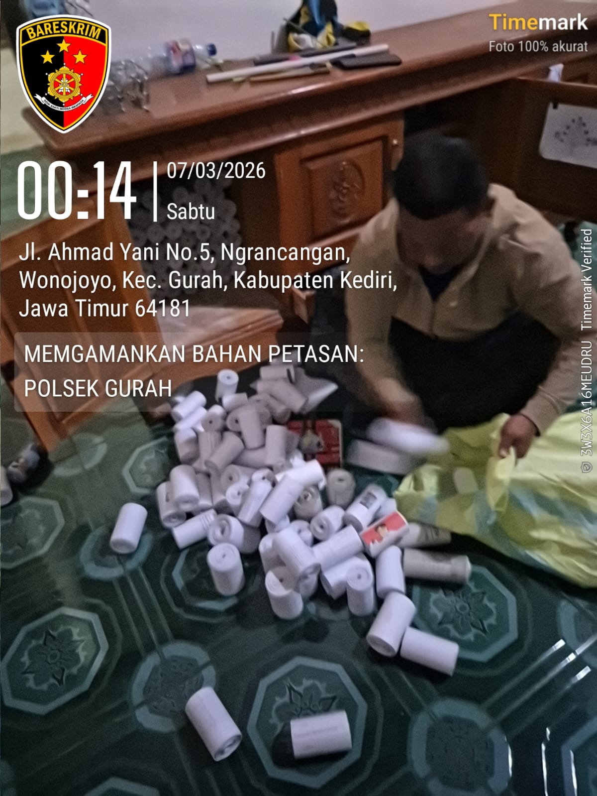 Kediri, Radarreclasseering.com – Polsek Gurah Polres Kediri melakukan kegiatan mitigasi peredaran dan pembuatan petasan di wilayah hukumnya, tepatnya di Dusun Aru-aru Desa Wonojoyo, Kecamatan Gurah. Dalam kegiatan tersebut, pihak berwenang menemukan terduga pelaku berusia di bawah umur, berinisial (P)(17 tahun) yang berdomisili di Dusun Aru Aru, Desa Wonojoyo.