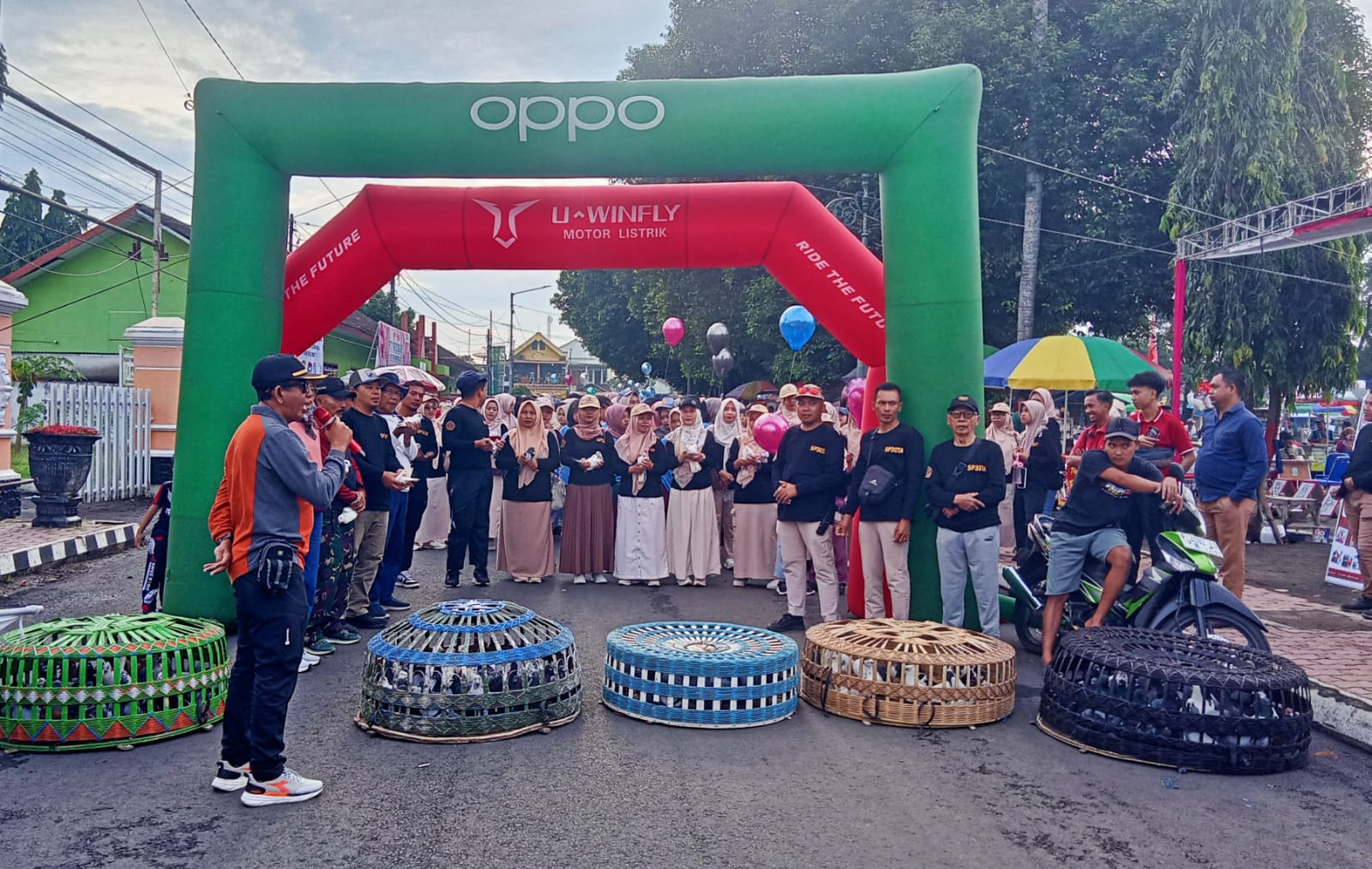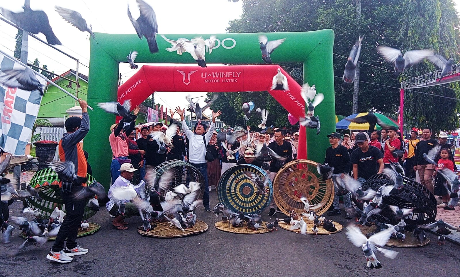 Dan sebelum di berangkatkan mari kita berdoa bersama. Dan sekaligus hitungan 1, 2, 3 secara simbolis pelepasan ratusan burung merpati,”ujar Farikhul