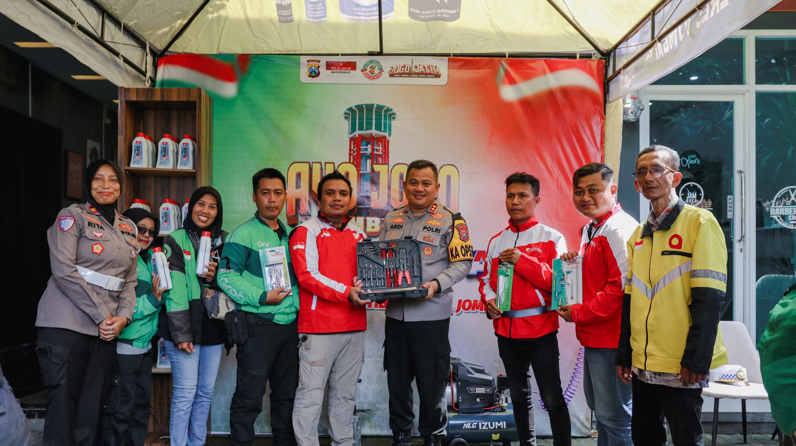 “Ojol Mart dan Auto Ojol ini kami siapkan sebagai tempat berkumpulnya para Ojol. Silakan dimanfaatkan, bahkan kalau perlu bayarnya seikhlasnya atau gratis. Semoga bisa membantu dan mendukung aktivitas bapak ibu semuanya,” tutur AKBP Ardi Kurniawan.